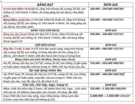 Quý khách hàng, đối tác có nhu cầu làm bảng hiệu quảng cáo, bảng hiệu hộp đèn quảng cáo, trang trí bảng biển logo chữ nổi cho văn phòng, công ty, doanh nghiệp, tòa nhà..có thể xem qua bảng báo giá bảng hiệu của chúng tôi dưới đây.